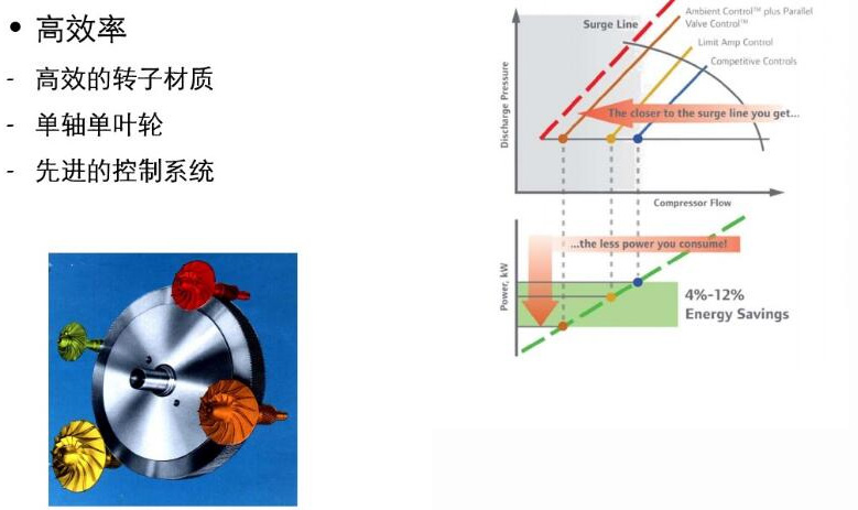 典型的單軸單葉輪設計縮短了轉子的長度,使懸臂的重量減至最小,從而使轉子組合具有最佳的穩(wěn)定性。葉輪與擴壓器之間的工作間隙不受空氣或水溫變化影響。半開式三元流后彎型葉輪(由英格索蘭公司最先開發(fā))使機組具有最佳的控制能力,同時使運行范圍最大CENTAC葉輪由特殊的高級鑄造不銹鋼經密加壓鑄造一次成型,具有高強度和耐腐蝕的特點。 推力環(huán)有效地將氣動推力分散傳遞至機殼上,使主齒輪不承受該負載,最大程度地延長了齒輪的壽命。獨特的圓弧三角形短軸確保了推力環(huán),葉輪與小齒輪之間牢固的自鎖連接,并使拆裝極為簡便。這種圓弧三角形的連接方式還增加了接觸面積,較之鍵連接或熱套連接,使用壽命更長。